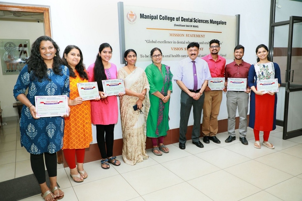 The team of MCODS, Mangalore comprising of Final year (part II) students: Ms.Mahima S, Ms.Pooja P Netalkar, Ms.Maithreye SR, Ms.Roopa Rachel Thomas, Mr.K Lokesh Sai and Mr. Nithin Vaishag R. has emerged as Runner Up at the “Achiever’s Day” a series of inter-collegiate competition organized by the Department of Pedodontics and Preventive Dentistry, AB Shetty Memorial Institute of Dental Sciences, Nitte University, Mangalore on 12th June, 2019. The team was guided by Dr. Karuna Y.M. The events held and prizes won were as follows: 1. 1st prize in Dr. Tooth Little (a clinical procedure based quiz): Mr. K Lokesh Sai and Ms. Pooja P Netalkar 2. 1st prize in Question and Answer (General Knowledge and Subject related quiz): Ms. Mahima S and Ms. Maithreye SR 3. 1st prize in Rapid fire round (All 6 members) 4. 1st prize in Mad Ads (All 6 members)