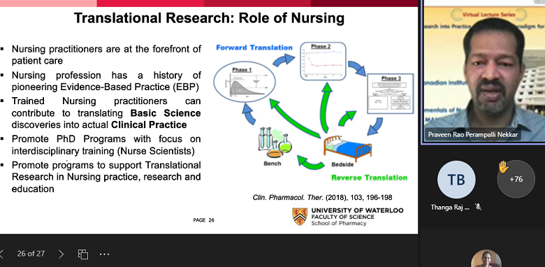 The fourth lecture series on “Challenges and Strategies in Translational Research Practice” was held on 4th March 2022 between 6.30 to 7.30 pm (IST). Dr. Praveen P Nekkar Rao, Assistant Professor, Pharmaceutical Science, School of Pharmacy, Health Sciences Campus, University of Waterloo, Waterloo, Canada was the speaker. He addressed the barriers that can curb productivity and the swift translation of research into new health care advances. Furthermore, he focused on the promotion of multidisciplinary collaboration among laboratory and clinical researchers as a strategy for the initiation and conduction of translational research in the nursing discipline.