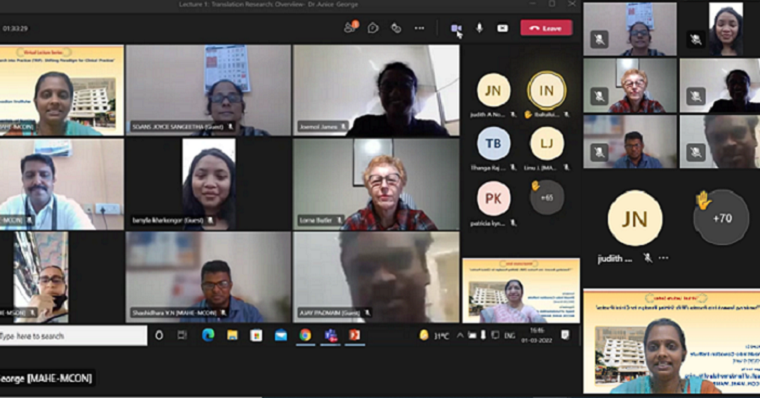 The Department of Fundamentals of Nursing, Manipal College of Nursing, Manipal Academy of Higher Education (MAHE), Manipal organized 5 days Virtual Lecture Series on “Translating Research into Practice (TRIP): Shifting Paradigm for Clinical Practice. This was funded by Shastri Indo-Canadian Institute (SCLS Grant)”. The inaugural program of this 5-day virtual lecture series was held on 1st March 2022 between 3.30 – 4.00 pm followed by the first-day session. Dr Prachi Kaul, Director, Shastri Indo-Canadian Institute, New Delhi, the Chief Guest for the programme addressed the participants during the inaugural program. The lecture series aimed to emphasize the efficient translation of research into clinical practice for the benefit of patient care by enhancing the knowledge on Translational Research its processes, models, challenges, and strategies.