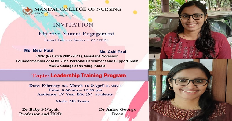 Manipal College of Nursing (MCON), MAHE, Manipal has organized an alumni guest lecture on the topic “Leadership Training Program” on 23 February 2021, 16 March 2021 and 6 April 2021 between 9.00 am- 12.30 pm. Ms Besi Paul and Ms Cebi Paul, Assistant Professors, Malankara Orthodox Syrian Church College of Nursing, Kolenchery, Kerala and Founder member of NOSC-The Personal Enrichment and Support Team (alumnus of MCON-BSc Nursing 2004 – 2008 batch; MSc Nursing 2009-2011 batch) were the resource persons. Ms Besi Paul discussed about the group dynamics, causes of poor group dynamics, how to turn a group into a team and strategies for improving team dynamics. She also stressed on leadership development, what makes a leader, the cultural shifts in leadership, qualities of a good leader and the leadership styles. Ms Cebi Paul highlighted on the communication etiquettes in the workplace and the effective use of language in communication. The sessions were enriched with group activities and enthusiastic participation by the students. The students expressed that the program was interactive and useful in identifying leadership qualities. The session was conducted as a webinar in Microsoft Teams. Fourth-year BSc Nursing students were divided into three batches (32 in each batch) to have better interaction. A total of 97 BSc Nursing students and five faculty members attended the sessions.