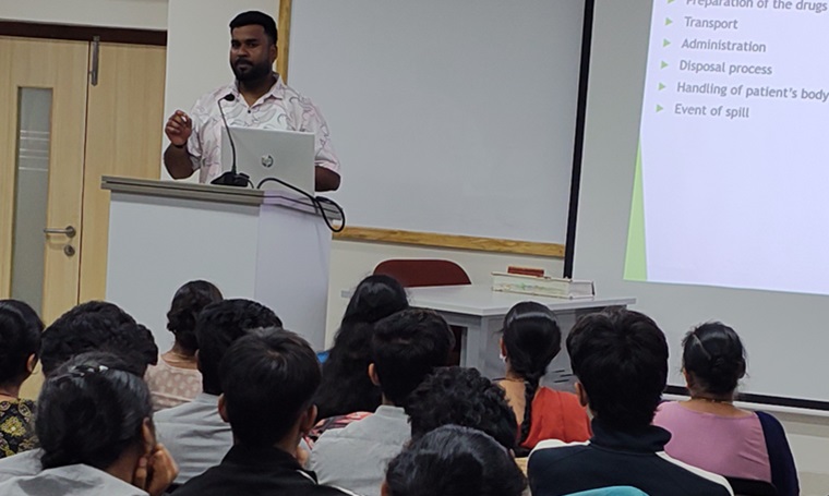 An Effective Alumni Engagement Guest Lecture was arranged by Manipal School of Nursing MCON, MAHE, Manipal on “Safety practices while handling chemotherapeutic drugs" for 3rd year GNM students on January 29, 2025. The resource person was Mr Siraj Salim Shaikh, an alumna of MSON, MCON, MAHE, Manipal, Diploma(N) batch (2014-2018). He explained the classification of chemotherapeutic drugs, preparation, and precautions to be taken while handling chemotherapeutic and vesicant drugs. There was active interaction between the students and the resource person, which led to a good learning experience. A total of 67 participants (GNM students and staff nurses of Paediatric Haemato-oncology) attended the session. Organizing interactions with experts in the field and preparing the student nurses for future healthcare services aligns with the Sustainable Development Goals, 4: Quality education.