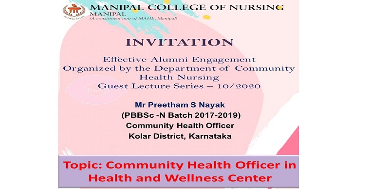Department of Community Health Nursing, Manipal College of Nursing Manipal, has organized alumni guest lecture on the topic ‘Community Health Officers in Health and wellness center’ on 16/10/2020 between 11 am -12 pm by Mr Preetham Nayak, Community Health Officer, Kolar District (alumnus of MCON PBBSc N – 2017-19 batch). He highlighted on the morbidity and wellness services available in the health and wellness centers and explained regarding e- Sanjeevi app, the new update on tele-consultation. The roles and responsibilities of community officer, career options as community Health officers were clearly explained. The session was deliberated using Microsoft teams platform. Total 62 participants including faculty members and students from 4th year BSc(N) practical batch III and II year PBBSc (N) attended the session. The program was coordinated by Mrs Reshma R Kotian, Lecturer, Manipal College of Nursing Manipal, MAHE, Manipal.