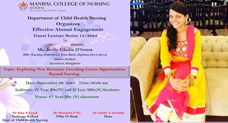To sensitize the final year students of MCON, an alumni guest lecture on the topic ‘Exploring new horizons: Unveiling career opportunities beyond nursing’ was organized by the Department of Child Health Nursing on 9th September 2023 from 9:00 am to 10:00 am. Ms. Josily Gladin D’Souza, Senior Analyst, Accenture, Bengaluru (alumnus of MCON-BSc-N - 2009-2013 batch) explained the various opportunities for graduate nurses after graduation. The session included the details of opportunities for work in the hospital and IT industry with details of job requirements and skills required for each job. She also briefed them on the importance of preparing and updating a resume. The session was experience-driven and very informative. The session was conducted as onsite in the classroom of MCON and was attended by 120 students and three faculty members.