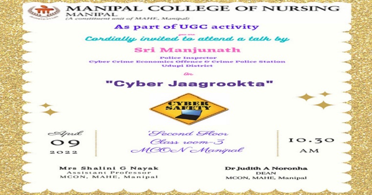 Manipal College of Nursing, MAHE, Manipal has organized an awareness session on the topic “Cyber Jaagrookta” on April 9, 2022, between 10.30 am and 12.15 noon. Mr Manjunath, Inspector, Cyber Crime Economic offences and Narcotic cell, Udupi District shared his expertise on the topic. He highlighted the applications, laws and guidelines to protect from cyber exploitation. He shared his expertise on different forms of cybercrimes including missing exploited children, hacking into the personal accounts of social media, frauds during internet transactions and online transactions, fake jobs & matrimony, impersonating etc. He stressed the need of using applications to lodge complaints against such cybercrimes for taking appropriate action at the earliest possible golden period of one to two hours for reducing the loss caused by such problems. He also mentioned the process of dealing with such crimes by the cyber department at the international, national, state and local levels. The audience of the session were also sensitised not to access the fake websites, thereby not allowing the hackers to enter into the system, not accessing the public wi-fi, being cautious while charging the devices in public places, beware of skimming devices, precautions of online buying and protecting the social media accounts with safe and unique passwords.