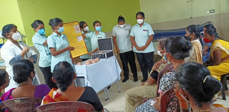 Globally, breast cancer awareness month remains despite the seemingly endless Coronavirus crisis. To create awareness among women, as part of Bharath ka Amruth Mahotsav activity, the Health Education Committee of the Student Nurses Association (SNA) - 2021 of Manipal College of Nursing, MAHE, Manipal, organized an awareness program on Breast cancer between 10.30 am to 12 noon on 9th October 2021 for the mothers and family members of antenatal and postnatal clients admitted in Women and Child health block of Kasturba Hospital, Manipal. The sessions were delivered by Health education committee representatives, Ms Levia Marina Lobo, Ms Shetty Swathi, Ms Nikshitha, Ms Jhanavi Crystal and Ms Aleena Jossy through discussion and demonstration. They said about the meaning, causes, signs and symptoms of breast cancer, steps of breast self-examination, myths and facts, and prevention and management. Students also emphasized on early detection by self-breast examination and regular screening and stressed about lifestyle modification to prevent breast cancer and promote optimum health. This program was coordinated by health education committee chairperson Ms Levia Marina Lobo, IV year BSc Nursing and Shetty Swathy, II year PBBSC Nursing, guided and supported by advisor Dr Yashoda Sathish, and co-advisor, Ms Prathibha Kamath, Assistant Professors, MCON, MAHE Manipal. All the sessions were informative. A total number of 20 participants benefitted from the program and it was well appreciated by them.