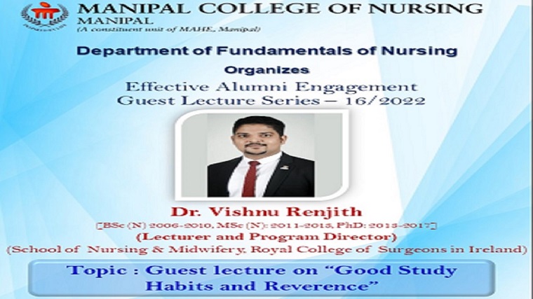 As part of the Effective Alumni Engagement Guest Lecture Series, a session on “Good Study Habits and Reverence” was organized by the Department of Fundamentals of Nursing, Manipal College of Nursing, MAHE Manipal on 5th August 2022 at 2 pm through the MS teams online platform.