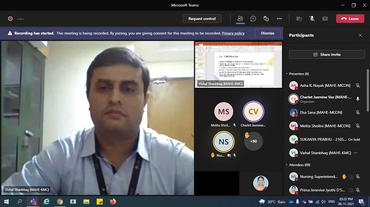 Dr Melita Sheilini Asst. Professor, Dept. of Medical-Surgical Nursing, MCON, MAHE, Manipal moderated the session and Mrs Charlet Jasmine Vaz Lecturer Dept. of Fundamentals of Nursing managed the event. Dr Elsa Sanatombi Devi, Professor, Department of Medical-Surgical Nursing was the convener. A total of 96 professionals participated in this virtual symposium.