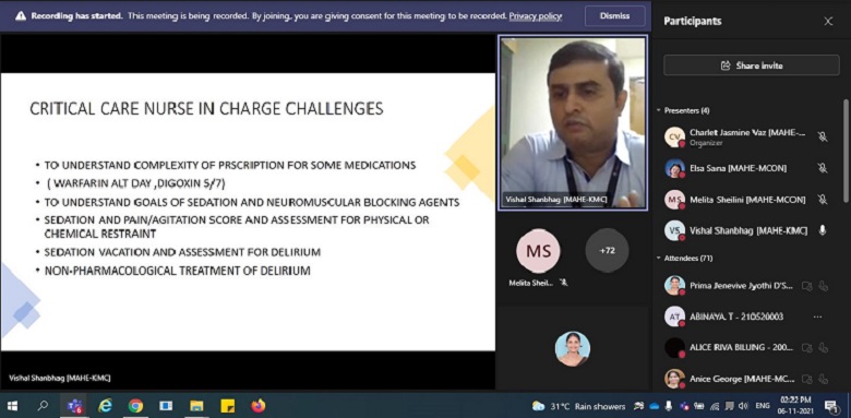 Dr Vishal Shanbhag, Assistant Professor, Critical Care Medicine KMC Manipal, MAHE, delivered the session. He discussed the challenges of drug policies in ICU, the role of nurse educator, challenges for ICU nurses and clinical pharmacist role, quality and safety issues in critical care and drug error categorization. Based on a case scenario he discussed the challenges for the intensivist and the critical care nurses. He emphasized having medication reconciliation in the hospital to avoid medication errors and improve patient safety.