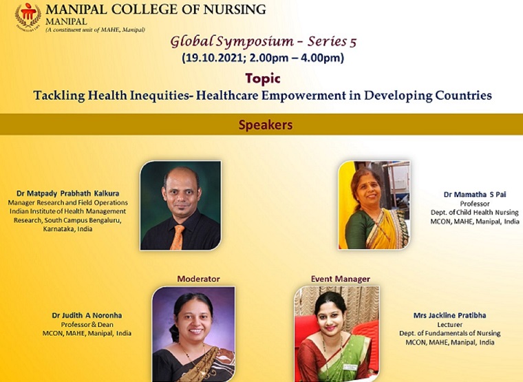 Global Symposium series - 5 on ‘Tackling Health Inequities- Healthcare Empowerment in Developing Countries’ was organized by the Team - Expanding Reach and Internationalization, Manipal College of Nursing, MAHE, Manipal on October 19, 2021, from 2 pm to 4 pm. Dr Mamatha S Pai, Professor, Dept. of Child Health Nursing, MCON, MAHE, Manipal and Dr Matpady Prabhath Kalkura, Manager Research and Field Operations, Indian Institute of Health Management Research, South Campus Bengaluru, Karnataka were the speakers for the session.