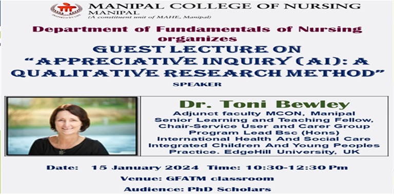 Dr. Toni Bewley, a senior teaching fellow at Edgehill University, UK, and an adjunct faculty of Manipal College of Nursing, addressed the PhD scholars on a qualitative research method, Appreciative Inquiry (AI), on January 15, 2024, at 10:30 AM.