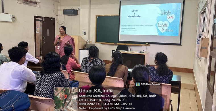 The distinguished speaker, Mrs. Priyanka Krishnan, Assistant Professor, Department of Clinical Psychology, MAHE, Manipal, led the discussion. She touched on various relevant topics such as positive psychology, its significance in promoting wellbeing, and its role in the mental health field. The lecture explored the concept of love and gratitude indepth, elucidating the importance of these emotions in healthcare.