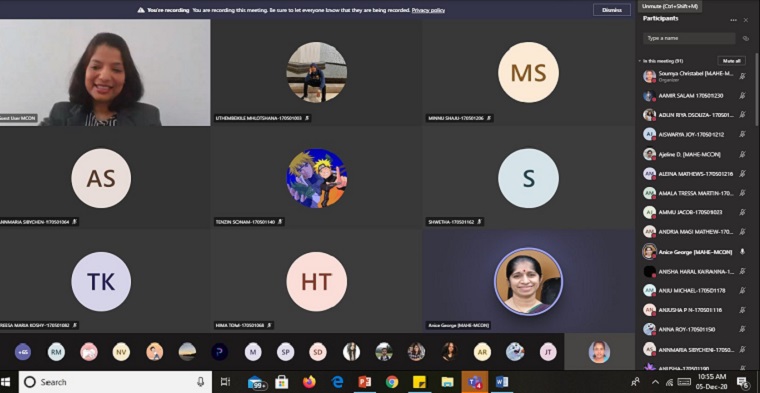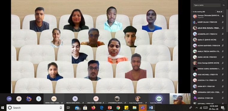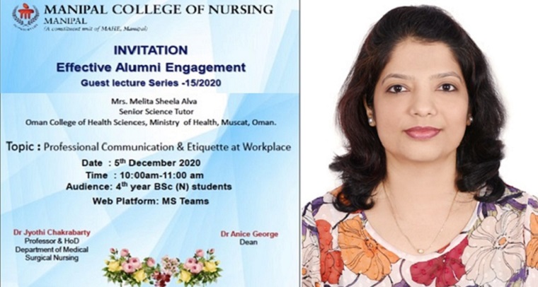 Department of Medical-Surgical Nursing, Manipal College of Nursing, Manipal organized a Guest Lecture on “Professional Communication & Etiquette at Workplace” on December 05, 2020, between 10.00 am & 11.00 am to 4th year BSc Nursing Internship students through Microsoft Teams Platform. Mrs Melita Sheela Alva, Senior Science Tutor, Oman College of Health Sciences, Ministry of Health, Muscat, Oman, addressed on the topic. She emphasized on essential communication skills for a successful career. The session highlighted on the image, communication, competence, demeanor in the profession. A total of 106 participants including 4th year B.Sc. Nursing Internship students and faculty members of the college participated in the session.