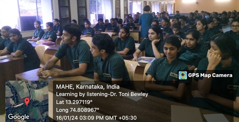 Dr Toni Bewley, a senior teaching fellow at Edgehill University, UK, and an adjunct faculty of Manipal College of Nursing shared her experiences on “The Power of Patient Stories” on January 16, 2024, at 3.00 PM for the 5th semester BSc Nursing at 2nd floor MCON classroom.