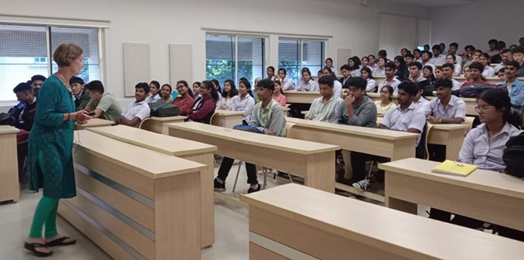 On September 4, 2024, a guest lecture on stress management for first-semester BSc nursing students by Dr. Toni Bewley, Adjunct Faculty from Edgehill University, UK, was conducted. The Department of Fundamentals of Nursing and Pillar III: Expanding Reach and Internationalization coordinated the session.