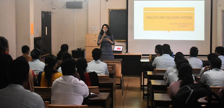 Ms Ameeka Shereen Lobo, Consultant, Public Health Foundation of India, Lucknow and Alumnus of MCON Manipal (MSc Nursing 2014-2016 batch) deliberated on different levels of health care delivery system of India. She also focused on the functions of the health system and the role of public and private health care providers. A total of 44 students and PhD scholars were present for the session. Participants clarified their doubts regarding the role of NGOs in the health care delivery system and the challenges faced by nurses at different levels.