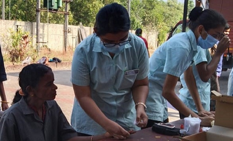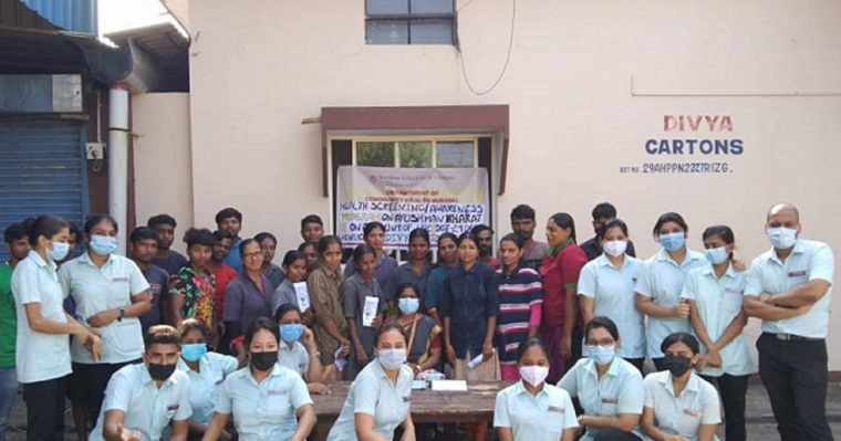 As part of Universal Health Coverage Day, the Department of Community Health Nursing and 4th Year BSc Nursing students of Manipal College of Nursing, Manipal conducted a “Health Screening and Awareness Programme on Prevention of Occupational Diseases & Injuries and Ayushman Bharat Scheme in India on 29 December 2021, for the factory workers at Hirebettu. Ms Levia Marina Lobo, 4th Year BSc Nursing student, MCON, Manipal welcomed the gathering and briefed about the activities to the employees.