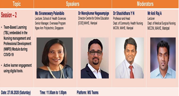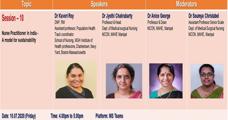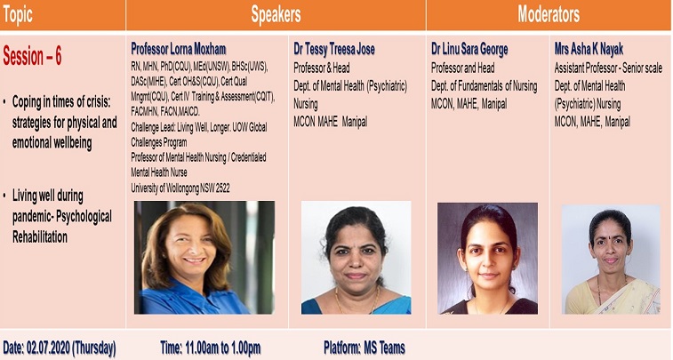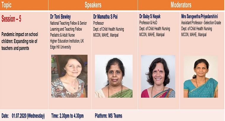 Nursing besides being noble, is an ever evolving profession, with empathy and inventiveness being the driving force behind quality patient care. Amidst the COVID-19 chaos, it was our profession that marched at the frontline. Digital campaigns and webinars prove to be a virtual boon and more so, it being organized by reputed institutions like Manipal College of Nursing, MAHE, Manipal. It was a matter of immense privilege and pride for me to be a part of this thought provoking webinar on the topic “Impact of Covid-19 Pandemic and Strategies for Mitigation”. I would like to congratulate Dr. Anice George, Dean and Organizing Chairperson and Dr. Elsa Sanatombi Devi, Professor and Convener, MCON, for organizing this wonderful webinar and seeing it through with perfection. It was an honor to have Dr. H Vinod Bhat, Vice Chancellor, MAHE Manipal as the chief guest for the inauguration of the virtual seminar series.