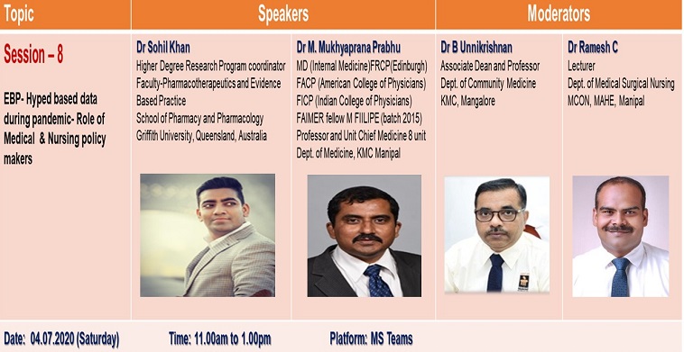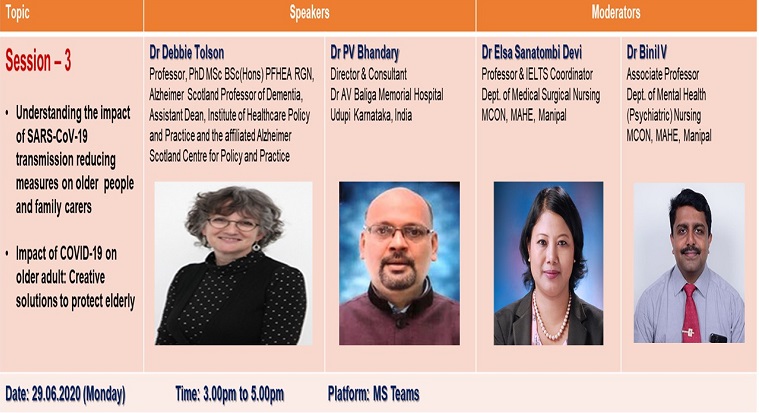 We began our journey on 23rd June 2020, with the international virtual seminar inaugurated by Dr H Vinod Bhat, the Vice Chancellor of MAHE, Manipal as the chief guest of the event. Dr Bhat has clearly highlighted the importance of MAHE playing a very significant role in bridging the gaps during this pandemic through activities that connects and rekindle our MoU partners and alumni, engaging the health care professionals with facts and figures and innovative strategies to curb this novel COVID-19 impact on our society at large. Manipal was honored to have Dr Roy K George, TNAI President with us during the inauguration. During his keynote address, gave the audience a strong support to work towards health care sustainability through innovative approach and collaborative practice and building employment for nurses achieve and maintain Sustainable development goals.
