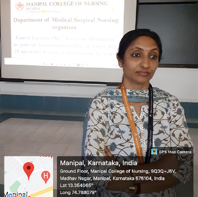 The Department of Medical Surgical Nursing, Manipal College of Nursing, MAHE, Manipal conducted a Guest Lecture on 21st June, 2022 as part of International Day of Yoga 2022 for the II Semester BSc Nursing students. The topic for the Guest Lecture was “Yoga for Humanity” which is the theme of this year’s Yoga Day. Dr Lavya Shetty, Lecturer, Division of Yoga, Centre for Integrative Medicine and Research (CIMR), MAHE, Manipal was the Resource Person. A total of 102 participants including students and faculty attended the session. Dr Lavya Shetty spoke on meaning of yoga, its origin, aims, concepts of ahara according to yoga and types of yoga. She also emphasized on the benefits of practice of yoga, practice of pranayama, practice of mudra, practice of asanas and benefits of dhyana along with a demonstration of pranayama.