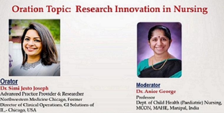 Following the inauguration, Oration in memory of Late Dr. Aparna Bhaduri on the topic, “Research Innovation in Nursing” was held. The oration was presented by Dr Simi Jesto Joseph, who is the alumna of MCON, Manipal, now the Advanced Practice Provider and Researcher, North-western Medicine Chicago, Former Director of Clinical Operations, GI Solutions of IL, Chicago, USA. She said that nurses are real-time problem solvers, innovators, and have creativity. She gave a historical overview on research in nursing across the world and in India and the various publications, societies, organisations and research developments in Nursing. She explained that innovation is the novel application of ideas, implementation of something new, improvement to an existing product or process and continued relevance. She emphasized the process of innovation, dimensions, need to conduct innovative research giving examples of the pandemic innovations in nursing which may stay in future healthcare delivery. She further highlighted that to prepare competent nurses- innovation and creativity are necessary for nursing education and practice. Dr Anice George, Professor, Department of Child Health (Paediatric) Nursing, MCON, MAHE, Manipal, moderated the oration by introducing both Dr. (Late) Aparna Bhaduri, and her contributions to nursing at MCON and in India and also the speaker.