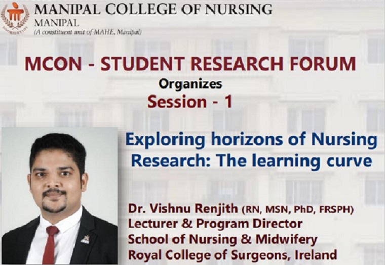 Manipal College of Nursing - Student Research Forum, MAHE, Manipal, organized the first session of the year-long lecture series on ‘Exploring horizons of Nursing Research: The learning curve’ on 11th February 2023, from 11.30 – 12.30 pm. The resource person for the session was Dr. Vishnu Renjith, Lecturer & Program Director, School of Nursing & Midwifery, Royal College of Surgeons in Ireland.