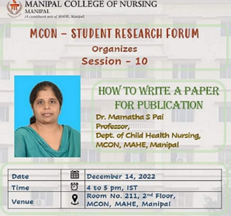 Manipal College of Nursing - Student Research Forum, MAHE, Manipal, organized the tenth session of the year-long lecture series on ‘How to write a paper for publication on 14 December 2022, from 4.00 pm to 5.00 pm. The Resource Person for the session was Dr. Mamatha S Pai, Professor, Department of Child Health Nursing, Manipal College of Nursing, MAHE, Manipal.