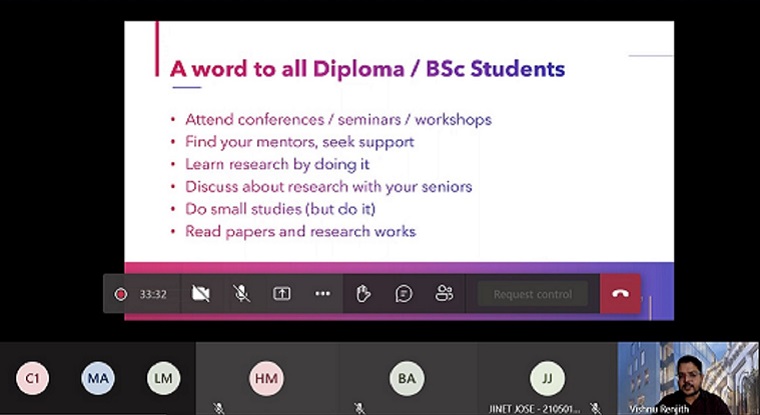 Dr Vishnu Renjith shared his experience in conducting his first research project and explained the challenges that could be faced while planning and conducting research and ways to overcome them. He also gave a word of encouragement to nursing students. The session was very informative and provided a well-appreciated guide for the new researchers to plan and implement research projects. A total of 155 participants, including undergraduate & postgraduate students, PhD scholars, project staff and faculty of MCON attended the session. E-certificates were given to all the participants.