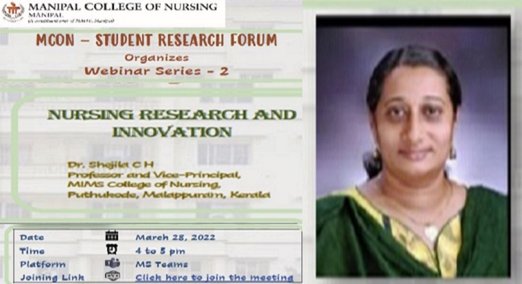 Manipal College of Nursing - Student Research Forum, MAHE, Manipal, organized the second session of the year-long webinar series on the topic - ‘Nursing research and innovation’ on March 28, 2022, from 4 pm to 5 pm. The Resource Person for the session was Dr Shejila C H, Professor-cum-Vice Principal, MIMS College of Nursing, Puthukode, Malappuram, Kerala.