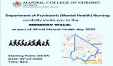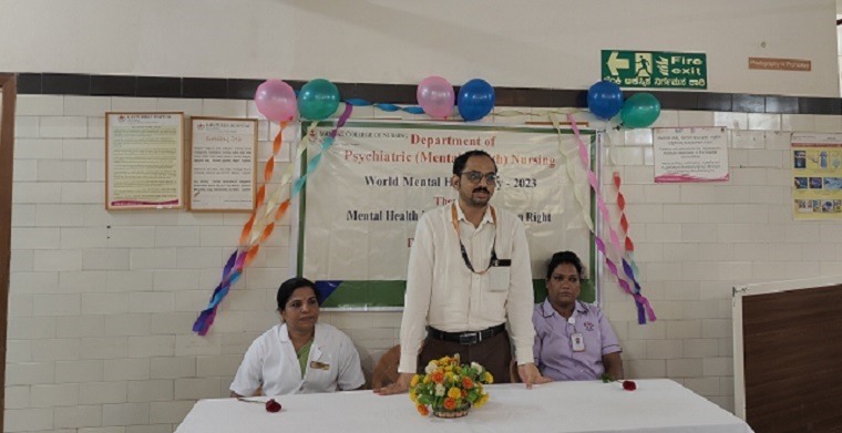 The Department of Psychiatric (Mental Health) Nursing, Manipal College of Nursing, MAHE, Manipal, along with the students conducted a series of events on account of observing World Mental Health Day 2023 on 9th and 10th Oct 2023, under the theme “Mental Health is a Universal Human Right”. The celebration aimed to bring awareness, inspire and voice out the importance and significance of mental health and mental illness for all. It highlights the need for mental health and mental illness advocacy, as the World Health Organization set to achieve the global objective “Comprehensive Mental Health Action Plan 2013-2030”. It comes under SDG 3, Good Health and Wellbeing.