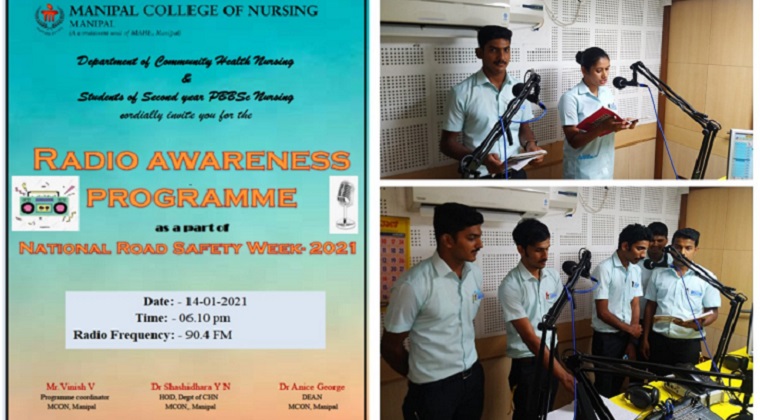 National Road Safety Week - 2021 was observed by the faculty of the department of community health nursing and students of second year PBBSc Nursing, Manipal College of Nursing, MAHE, Manipal on January 14, 2021, by conducting a Radio awareness programme for the public. The programme broadcasted by Community radio, Manipal at FM 90.4 on January 14, 2021, at 6.15 pm onwards.