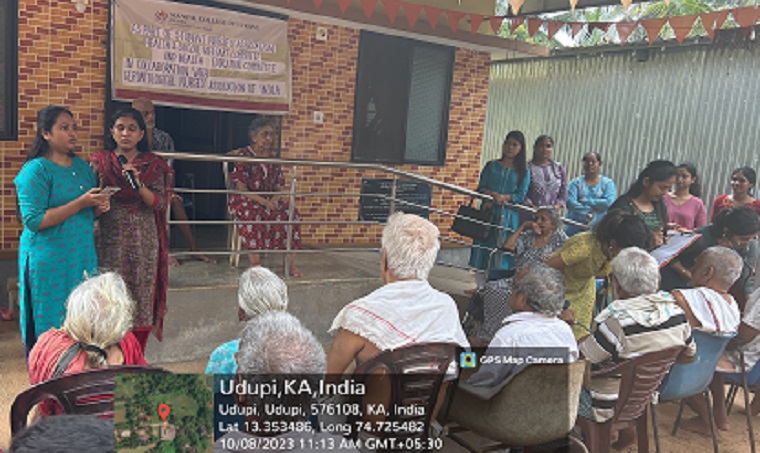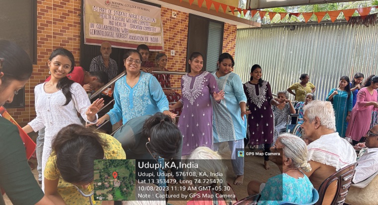 The Health and Social Welfare Committee and the Health Education Committee of Students Nurse’s Association 2023-2024 in association with the Gerontological Nurse’s Association of India, Manipal College of Nursing Manipal, MAHE, Manipal organized an “Old age home visit” at Shree Krishna Vrudhashrama at Moodubettu, Kodavoor, Udupi on 8th October 2023, from 10.30 am to 12.30 pm. Ms. Shreya Shetty, IV Year BSc Nursing student welcomed the gathering and the program was continued by seeking blessings from the almighty with a prayer song by Ms. Vina Tina D Souza and Ms. Lisa Aslin Mascarenhas, IV year BSc Nursing students and the members of Health Education Committee. Group song and group dance performed by the members of the Health and Social Welfare Committee. The health talk was delivered by Mr Pradeep Panduranga Nayak, II year PBBSc Nursing student, Ms Shreya Shetty and Ms. Vina Tina D Souza IV year BSc Nursing students. Blood pressure and Random blood sugar assessment was done followed by games organized for the participants. Prize distribution to the winners of different games was done. Refreshments and gifts were distributed and the program was concluded with words of gratitude expressed by Ms. Jhanavi Mathur, IV year BSc Nursing student, a member of the Health Education Committee. A total of 20 participants benefitted from the program. Twenty students and 8 faculty members were involved in the program. The program was well appreciated by the participants and Ms Nagaratna Patil, incharge of the Shree Krishna Vrudhashram. She also thanked the Manipal College of Nursing Manipal, MAHE, Manipal for organizing a very beneficial program for the inmates of the ashram. The session contributes to SDG: Goal 3- Good health and wellbeing.
