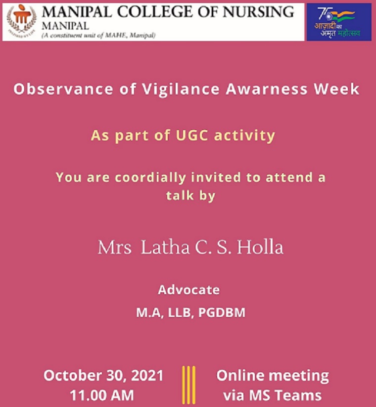 As per the circular from the University Grants Commission (UGC), Manipal College of Nursing (MCON), MAHE, Manipal has observed Vigilance Awareness Week with the theme “Independent India @75: Self Reliance with Integrity (Swatantra Bharat @75: Satynishtha se Atmnirbharta).