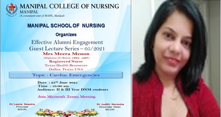 Manipal School of Nursing, MCON, MAHE, Manipal had organized a guest lecture on the topic “Cardiac Emergencies” by Mrs Meera Menon, on 25th June 2021 at 10 am through the MS Team platform.