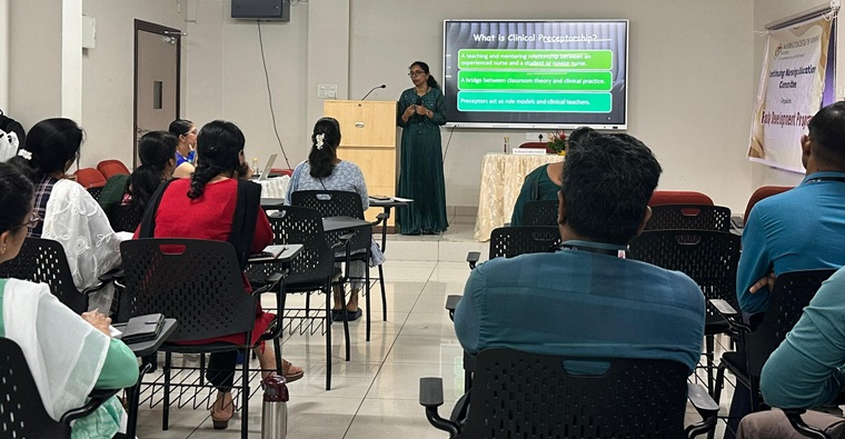 It was followed by a session on Clinical preceptorship by Dr Blessy Prabha Valsaraj, Associate Professor, Department of Community and Mental Health, College of Nursing, Sultan Qaboos University, Oman. Her session emphasized the role of preceptors, the qualities of an effective teacher, setting the stage for learning, and providing feedback in student learning.
