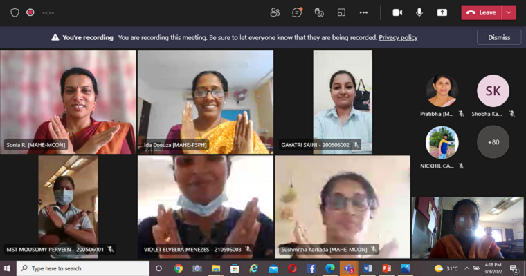 Dr Sushmitha R Karkada, Assistant Professor Senior Scale, Dept. of OBG (N) MCON, MAHE Manipal gave the welcome address. Mrs Ranjani P, Assistant Professor Senior Scale, Dept. of OBG (N) MCON, MAHE Manipal, introduced the speaker. Dr Sonia R B D’Souza, Professor & Head, Dept. of OBG (N) MCON, MAHE Manipal, rendered the vote of thanks. MST Mousomy Perveen, PG student, II MSc, Dept. of OBG (N) MCON, MAHE Manipal, moderated the webinar. Around 103 participants benefited from this program.