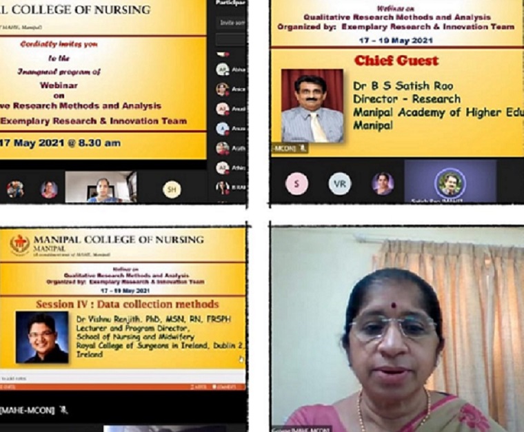 The Exemplary Research & Innovation Team - Institute of Eminence (IoE) of Manipal College of Nursing (MCON), MAHE, Manipal organized three days’ Webinar on “Qualitative Research Methods and Analysis” from 17th May 2021 to 19th May 2021 through the MS Teams platform. The Chief Guest for the inaugural program, Dr Satish Rao, Director-Research, MAHE Manipal, during his speech, highlighted the importance of conducting research and publishing the findings in high-quality journals.