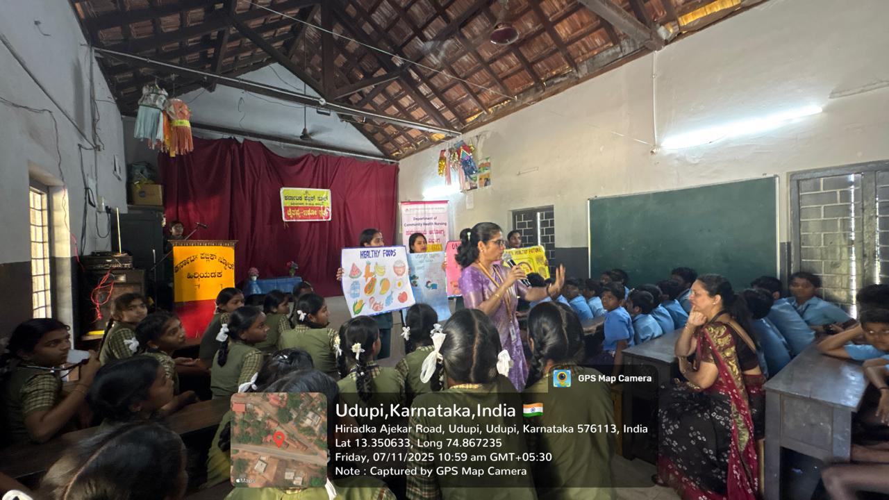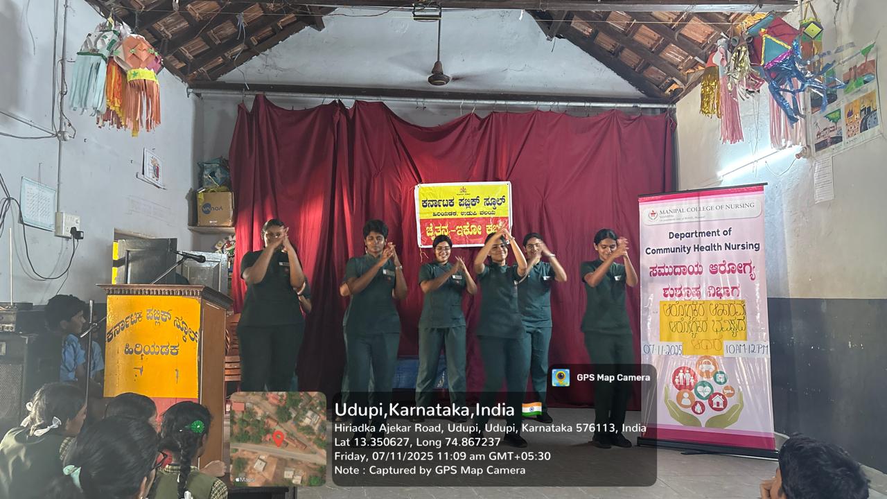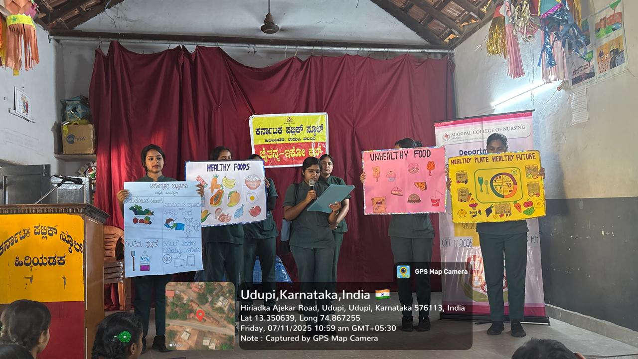 The faculty of the Department of Community Health Nursing and the students of the 7th semester BSc Nursing, Manipal College of Nursing, MAHE, Manipal, organized a School Health Programme on Nutrition Awareness titled “Healthy Plate, Healthy Future” at Karnataka Public School, Hiriyadka, Udupi Taluk, on 7th November 2025. Ms. Esther, a 7th semester BSc Nursing student at MCON, served as the Master of the Ceremony and warmly welcomed the gathering. Mrs Revathi, Headmistress of Karnataka Public School, Hiriyadka, addressed the students and emphasized the importance of maintaining a healthy diet during childhood to promote overall growth and development. Following this, Ms. Surekha, Lecturer, Department of Community Health Nursing, MCON, MAHE, Manipal, enlightened the young minds on the significance of good nutrition, the ill effects of unhealthy eating habits, and motivated the students to adopt healthy dietary practices for a bright and healthy future.