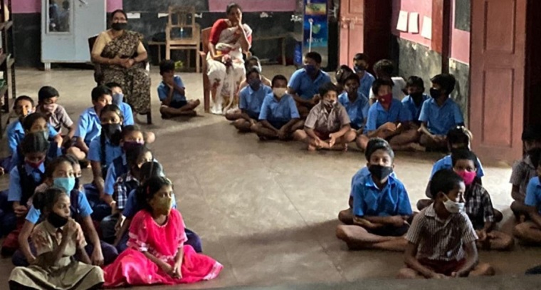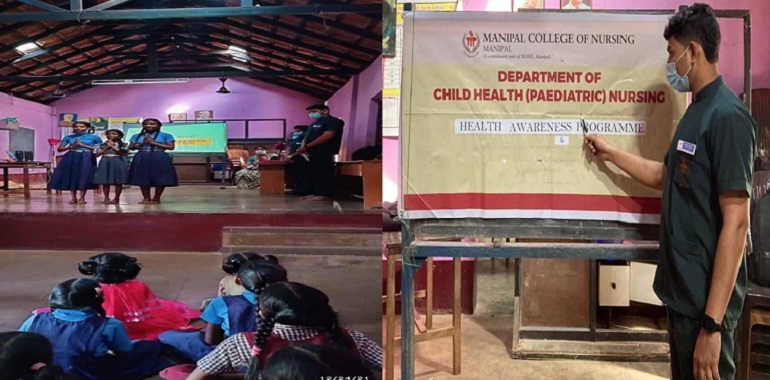 As part of an outreach program, the First Year PBBSc Nursing students from Department of Child Health Nursing, Manipal College of Nursing (MCON), Manipal Academy of Higher Education (MAHE), Manipal, under the guidance of Dr Yashoda Sathish, Assistant Professor, Department of Child Health Nursing, MCON, Manipal organized a school health program on 24th December 2021, between 2:00 p.m. and 4:00 p.m. The main aim of the program was to create awareness on “Accident prevention, balanced diet and prevention of communicable diseases” for the students of primary school and teachers of Government Primary School, Manchikodi, Udupi district.