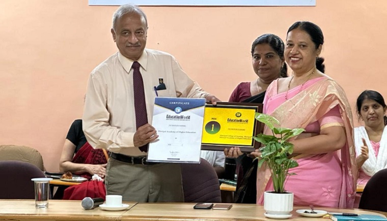 Lt. Gen. (Dr.) M. D. Venkatesh, Vice-Chancellor, Manipal Academy of Higher Education, Manipal visited Manipal College of Nursing, MAHE, Manipal on 10th June 2023. He handed over the EducationWorld India Higher Education Ranking 2023-24 award to Dr. Judith A Noronha, Dean, MCON. On this occasion, he congratulated the Team MCON for their outstanding performance and encouraged them to continue the good work with team spirit. He also assured that MAHE Administration will provide the necessary support for the smooth functioning of the college.