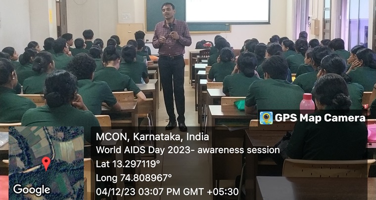 An awareness session on HIV/AIDS for first-semester BSc Nursing students was delivered by Dr Shashidhar V, Professor, Department of Microbiology, Kasturba Medical College, MAHE, Manipal, on December 4, 2023. The resource person explained HIV-related causes, risk factors for transmission, access to effective HIV prevention, diagnosis, treatment, and care, including opportunistic infections, lifesaving antiretroviral treatment (ART), social stigma, and enabling people living with HIV to lead long and healthy lives. The session was very informative. A total of 135 students benefitted from the awareness session.