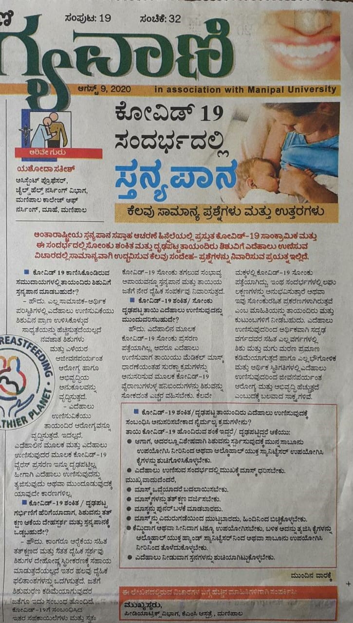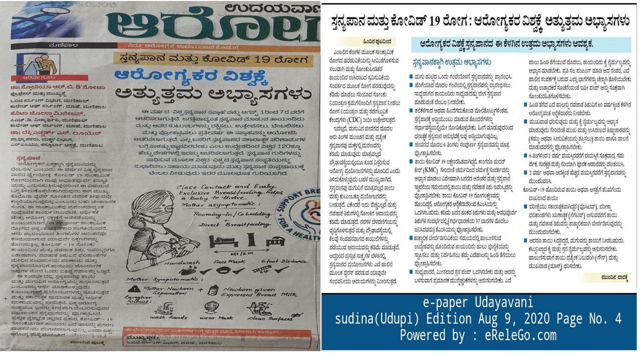 To create awareness to a wider range of public, articles in newspaper regarding breastfeeding and its importance were written in the local language by Mrs. Yashoda S, Assistant Professor- Senior Scale, Dept. of Child Health Nursing and Dr Sonia RB Dsouza, HOD, Dept. of OBG Nursing, MCON, Manipal.