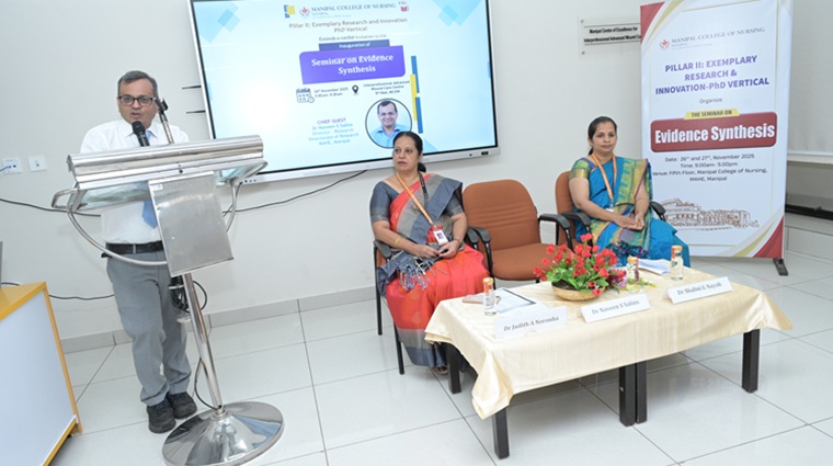 The PhD Vertical of Pillar II: Exemplary Research and Innovation, Manipal College of Nursing (MCON), Manipal Academy of Higher Education (MAHE), organized a two-day seminar on Evidence Synthesis on 26th and 27th November 2025 from 9:00 am to 5:00 pm. Dr Judith A. Noronha, Dean, MCON, welcomed the gathering and provided an overview of the program. The Chief Guest, Dr Naveen S. Salins, Director-Research, Directorate of Research, MAHE, emphasized the importance of incorporating evidence into practice for the benefit of stakeholders.