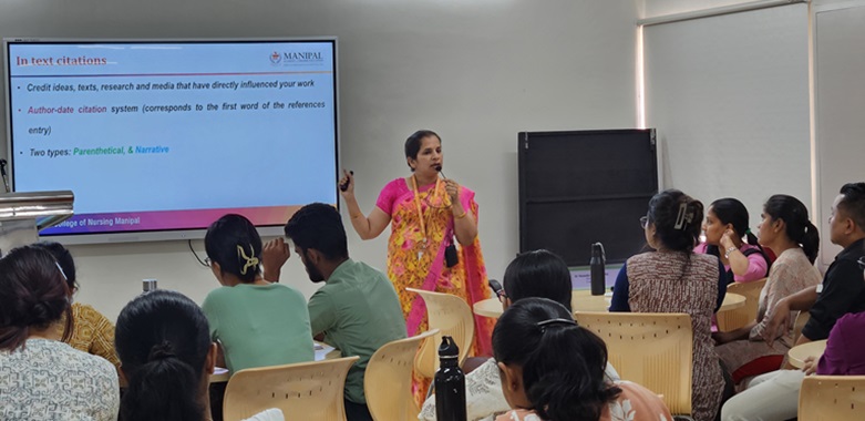 Pillar II Exemplary Research and Innovation, along with the Student Research Forum of Manipal College of Nursing, MAHE, Manipal, conducted the second session of 2025 on the topic “APA Guidelines” on 10th April 2025, from 2:00 p.m. to 3:00 p.m. The session was led by Dr. Shalini Ganesh Nayak, Assistant Professor- Senior Scale, Department of Medical-Surgical Nursing, Manipal College of Nursing, MAHE, Manipal. The session focused on achieving Sustainable Development Goal 4—Quality Education. Dr. Shalini provided a comprehensive explanation of APA guidelines, including the regulations it covers, the various APA citation styles, document formatting, preparation of tables and figures, in-text citations, and the reference section. The session was both inspiring and informative, and positive feedback was received from participants. A total of 50 participants, including undergraduates, postgraduates, research scholars, and faculty members, attended the session, and e-certificates were awarded to all attendees.