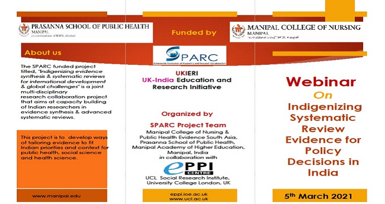 Manipal College of Nursing (MCON), Manipal Academy of Higher Education (MAHE) and Public Health Evidence South Asia (PHESA), Prasanna School of Public Health (PSPH), MAHE, Manipal, organized a webinar on “Indigenizing Systematic Review Evidence for Policy Decisions in India” in collaboration with EPPI-Centre, Social Research Institute, University College London, UK.