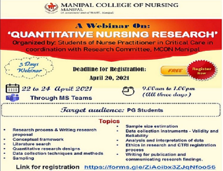 The first-year students of Nurse Practitioner in Critical Care (NPCC) Postgraduate Residency Program, Medical-Surgical Nursing department, in collaboration with Pillar 2 (IoE): Exemplary Research and Innovation of Manipal College of Nursing, MAHE, Manipal organized a three days’ webinar on ‘Quantitative Nursing Research’ from 22nd to 24th April 2021 through Microsoft Teams online Platform. The webinar focused mainly on the quantitative nursing research methodology.