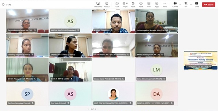 The two days webinar on ‘quantitative nursing research’ was held between June 26 and 27, 2025 through Microsoft Teams online platform. This was organized by the first-year students of Nurse Practitioner in Critical Care (NPCC) Postgraduate Residency Program, Medical Surgical Nursing department, in collaboration with Pillar 2 (IoE): Exemplary Research and Innovation: Undergraduate and Postgraduate vertical of Manipal College of Nursing (MCON), MAHE, Manipal.