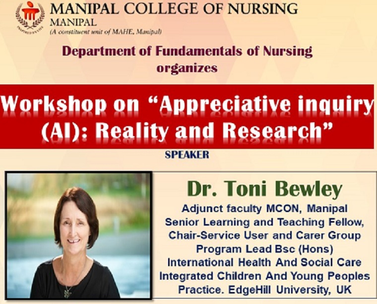 A half-day workshop on Appreciative Inquiry (AI): Reality and Research was organized by the Department of Fundamentals of Nursing, MCON, MAHE Manipal on 09.09.2022 between 9.30 am and 12.30 pm in the GFATM classroom of MCON. The Resource Person for the workshop was Dr. Toni Bewley, the Adjunct faculty of MCON and Senior Lecturer, School of Nursing, Edgehill University.