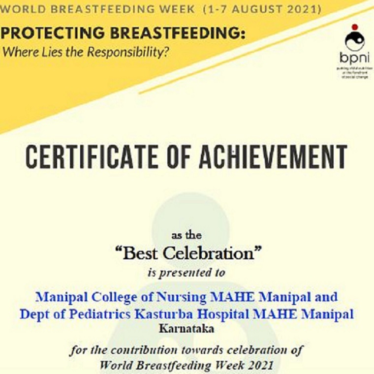 Manipal College of Nursing, MAHE, Manipal and Department of Pediatrics Kasturba Hospital, Manipal in collaboration with Indian Academy of Pediatrics, Udupi branch bagged the "Best Celebration" certificate of achievement as part of the World Breastfeeding Week celebration held during August 1 to 7, 2021. Breastfeeding Promotion Network of India (BPNI) coordinated these actions all over the country. This year’s theme was “Protecting Breastfeeding: Where Lies the Responsibility?” The overall program was coordinated by Dr Yashoda Sathish, Assistant Professor, Department of Child Health Nursing, MCON, MAHE, Manipal.