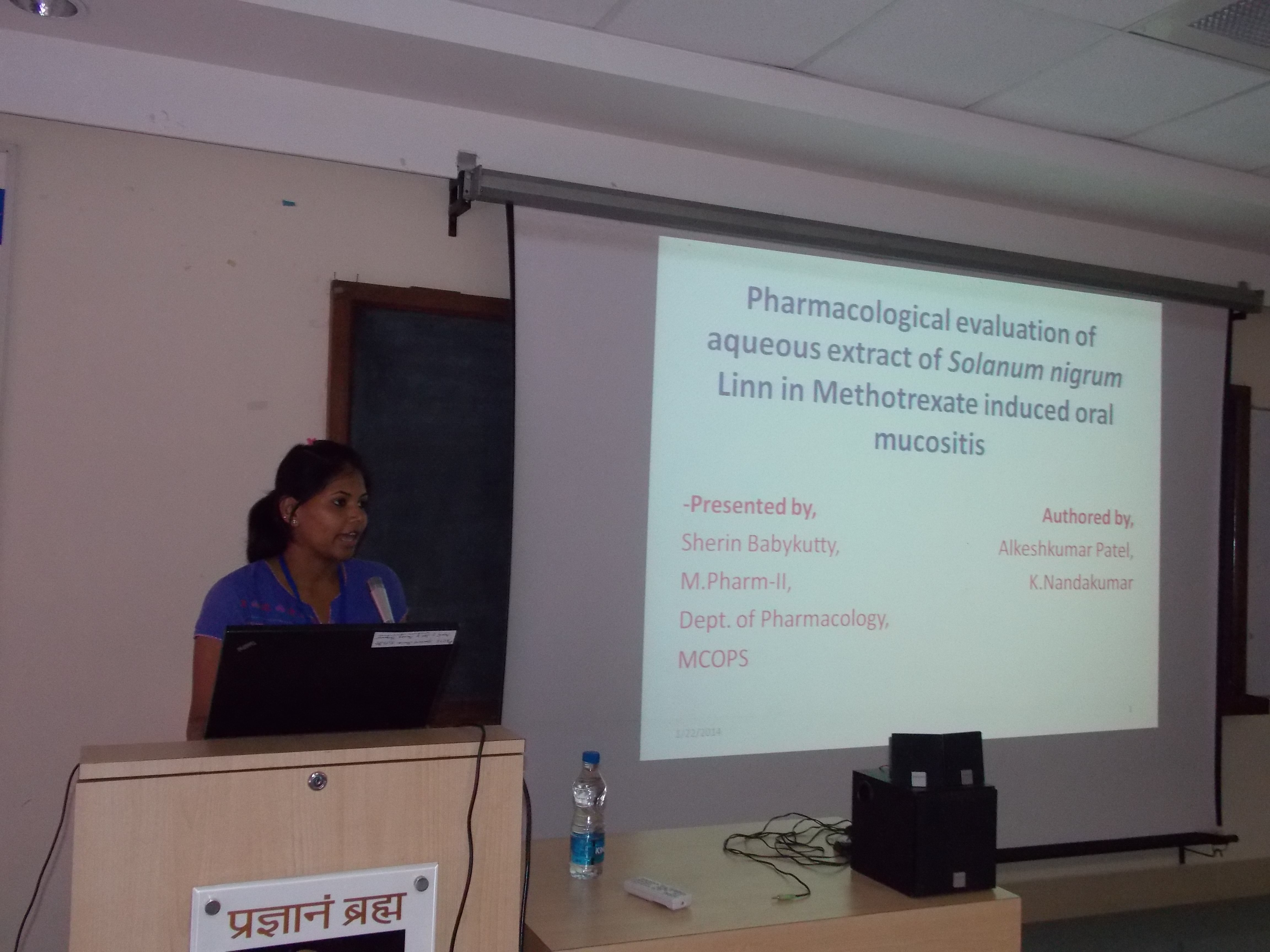 The Department of Pharmacology, MCOPS is involved in research along with its academic activities. From 2001 onwards until 2019, the department has published 250 research papers in reputed national and international journals. The staff, research scholars and postgraduate students have also attended national and international conferences and made paper/poster presentations of their research work. Cancer is one area where the department has contributed significantly. Besides, active research is currently on in wound repair, inflammation, diabetes, dyslipidemias, hypertension, learning and memory, Alzheimer’s disease, Parkinsonism and behavioural studies. New targets for the treatment of these diseases are being sought through in vitro and in vivo experiments. The faculty and research scholars of the department have secured several grants to promote research. To put this in perspective, a few grants are being listed. They are All India Council of Technical Education’s (AICTE) Research Promotion Scheme (RPS), Modernization and removal of obsolescence (MODROBS) and Career Award for Young Teachers; DST Fast-track Scheme for Young Scientists, etc. The department has labs dedicated for research. Research is supported by excellent lab facilities with sophisticated instruments, most of them procured through grants from funding agencies. Consequently, the department boasts the presence of Flow Cytometer, Western Blot set up, HPLC, gel documentation, ELISA plate reader, semi-auto analyser, inverted microscope, spectrophotometers, Ugo Basile plethysmometer, analgesimeter, Power Lab and so on. A cell culture lab helps experiments using cell lines. Work on cell lines is much more ethically acceptable than work on live animals. Tie-up with industries has given rise to research projects, beneficial to both the institution and industry concerned. A few candidates are able to carry out their PhD work in collaboration with industries. Plant extracts and compounds isolated from plants have been used for research. Significant work is in progress on developing new chemical entities (NCE) as drug candidates.