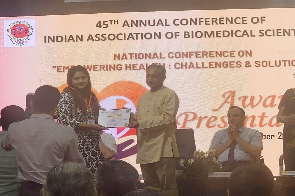 Pharmaceutical Sciences, MAHE, received the "Best Paper Award" for her research work entitled Silodosin & Acenocoumarol, an anti-non-small cell lung cancer agent: an in silico, in vitro and in vivo prospective; in the "45th Annual Conference of Indian Association of Biomedical Sciences; Theme: Empowering Health- Challenges and Solutions" under category " Treatment Development" on 9 November 2024.The award came with a certificate and a gold medal.